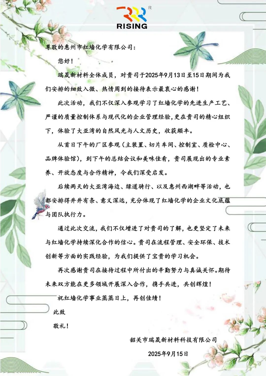 展望未来,我们坚信,合作的基础不仅仅是业务往来,更是彼此的信赖、共同的理念与资源的互补。我们期待,能以此次访问为全新的起点,与红墙化学展开更深入、更广泛的交流。让我们共享资源、共谋发展、互学互鉴,共同开拓更广阔的市场,成就真正的合作共赢!